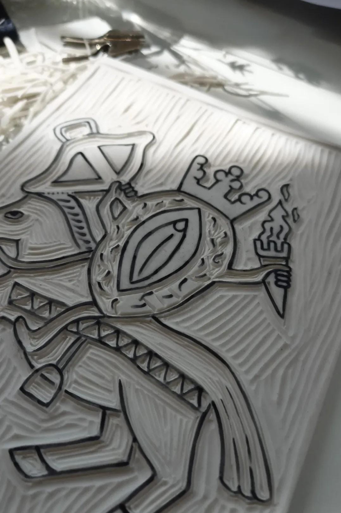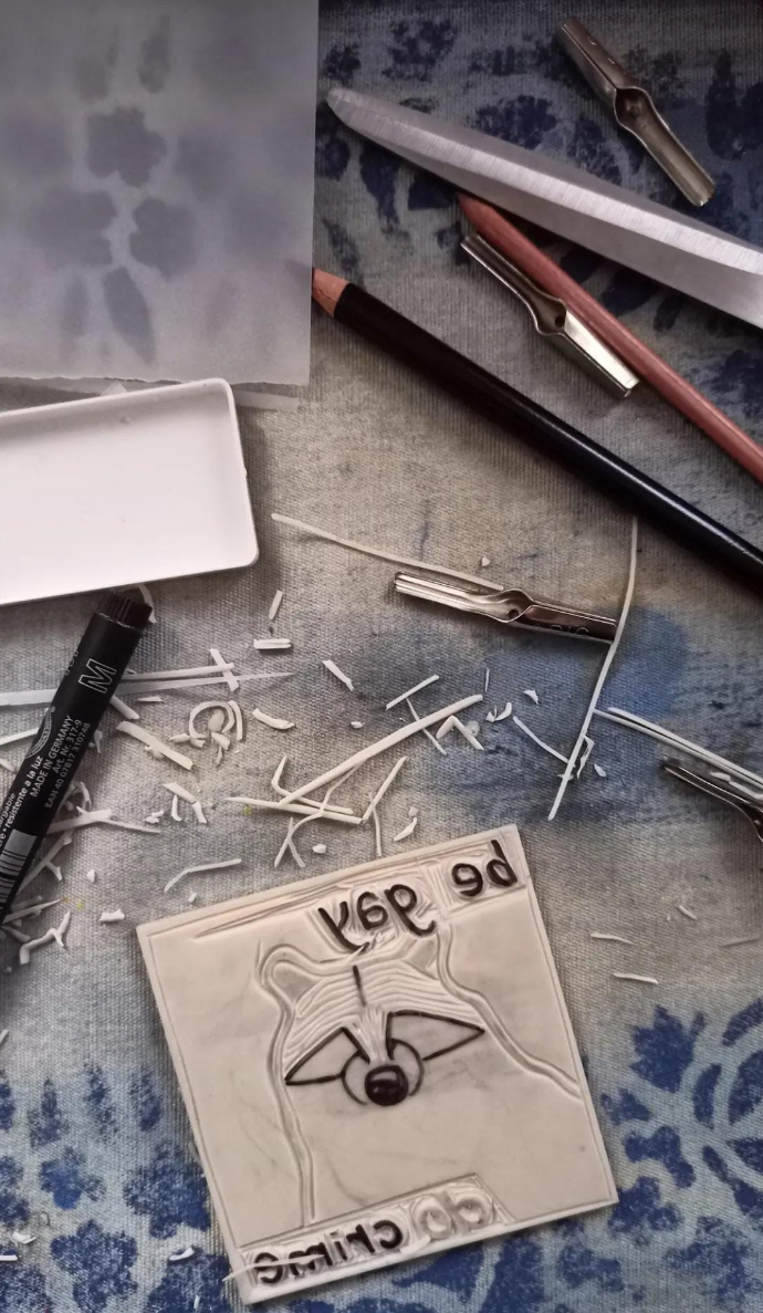 I wanted to challenge myself with being bolder, and gayer, also, why not, a new medium. I bought myself a few tools for linocut. A goofy raccoon stealing a slice of